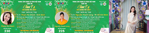 Mới đây, BTC đã tiếp tục công bố Top thí sinh tiếp theo đủ điều kiện bước vào hành trình chinh phục mùa giải thứ 2. Đến từ những tỉnh thành khác nhau, nhưng họ đều có chung một niềm đam mê cháy bỏng với những giai điệu quê hương. Hãy cùng theo dõi và ủng hộ cho các thí sinh dự thi Tình ca quê hương Việt Nam.